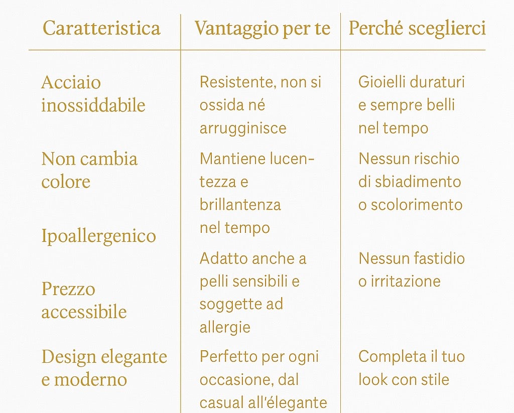Indossali al mare, in piscina, sotto la doccia, i nostri gioielli in acciaio inossidabile non cambiano colore e resistono all'acqua. BELLEZZA e RESISTENZA, ogni giorno con te.
