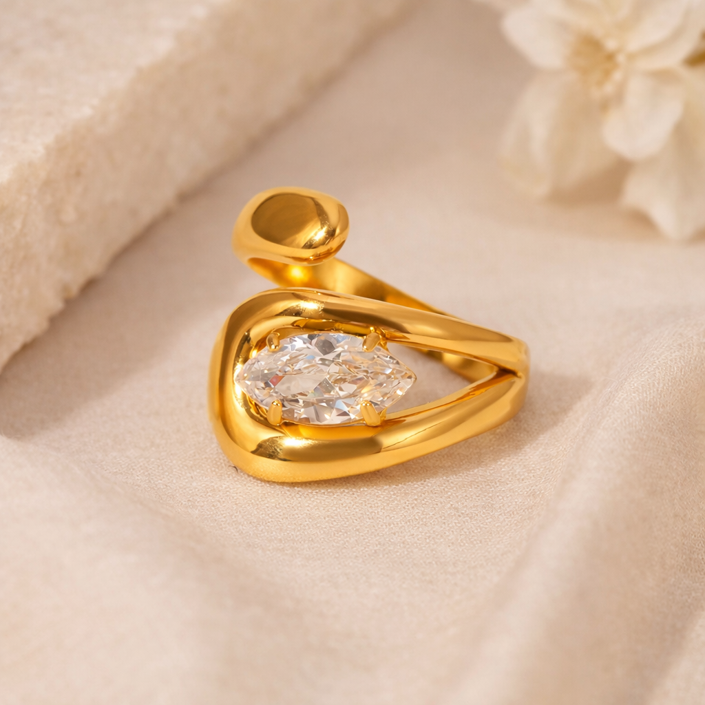 Dal design moderno e raffinato, questo anello avvolge il dito con linee morbide e fluide, impreziosite da una luminosa pietra a forma di goccia. Un gioiello elegante ma originale, perfetto per distinguersi con semplicità.