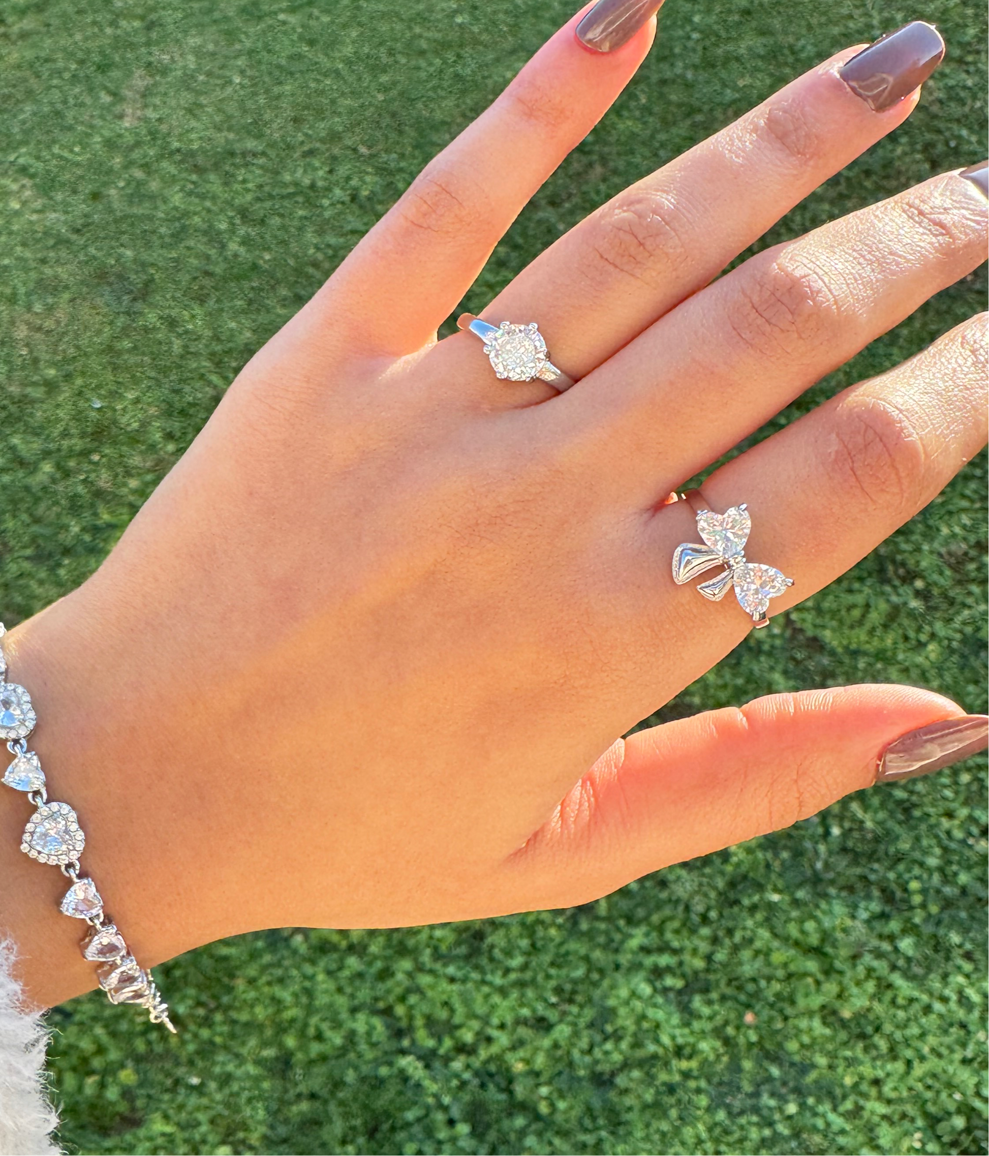 Anello regolabile in acciaio inossidabile con fiocco decorato da luminosi cristalli a forma di cuore. Un accessorio elegante, perfetto per aggiungere un tocco di raffinatezza a qualsiasi outfit.