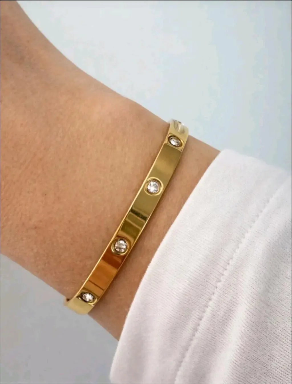 Il design rigido e minimal viene impreziosito da zirconi luminosi, che catturano la luce e donano al polso un tocco raffinato e sofisticato.