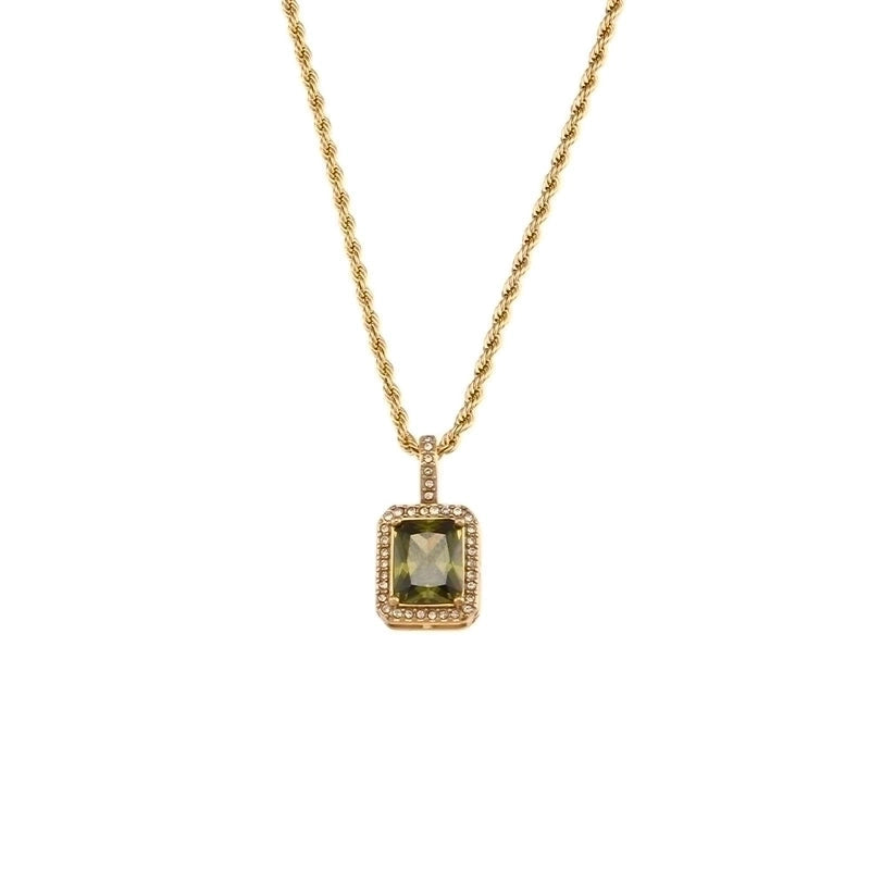 Collana in acciaio inossidabile con catena dorata intrecciata e pendente rettangolare decorato da una pietra centrale, incorniciata da dettagli brillanti. Un design minimal ed elegante. Disponibile in diverse colorazioni