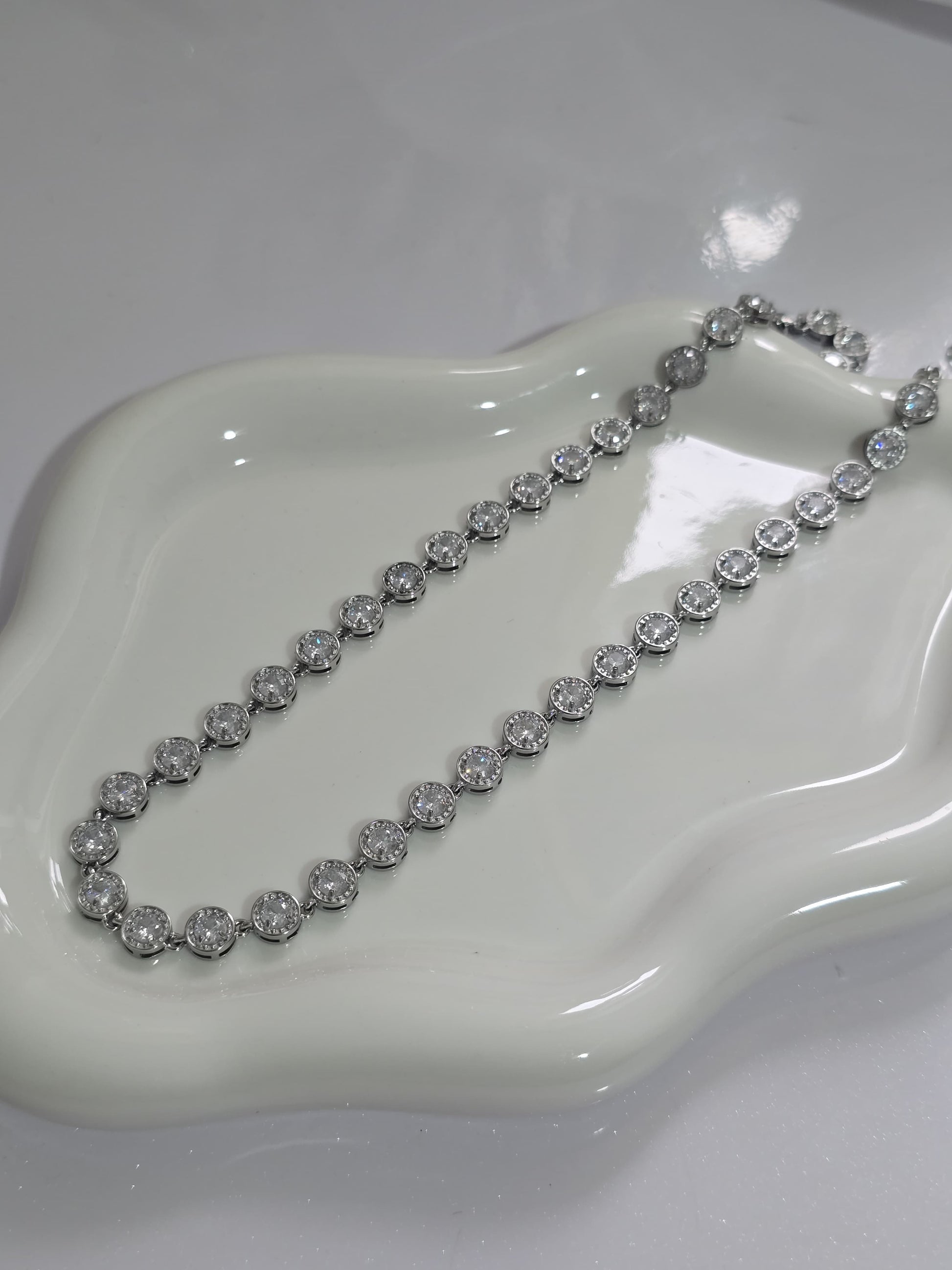 Elegante collana in acciaio inossidabile con una fila di zirconi incastonati in montatura circolare. Un design luminoso e raffinato, ideale per aggiungere un tocco di classe a qualsiasi outfit.