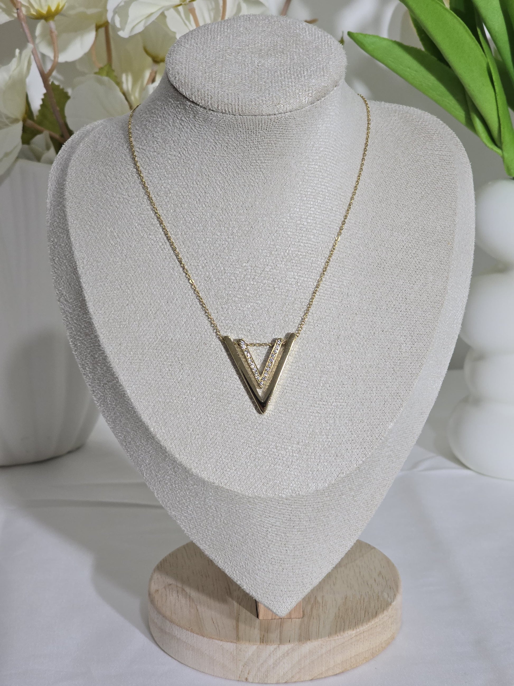 Collana in acciaio inossidabile,con un pendente minimalista a forma di doppia “V”, impreziosito con zirconi.