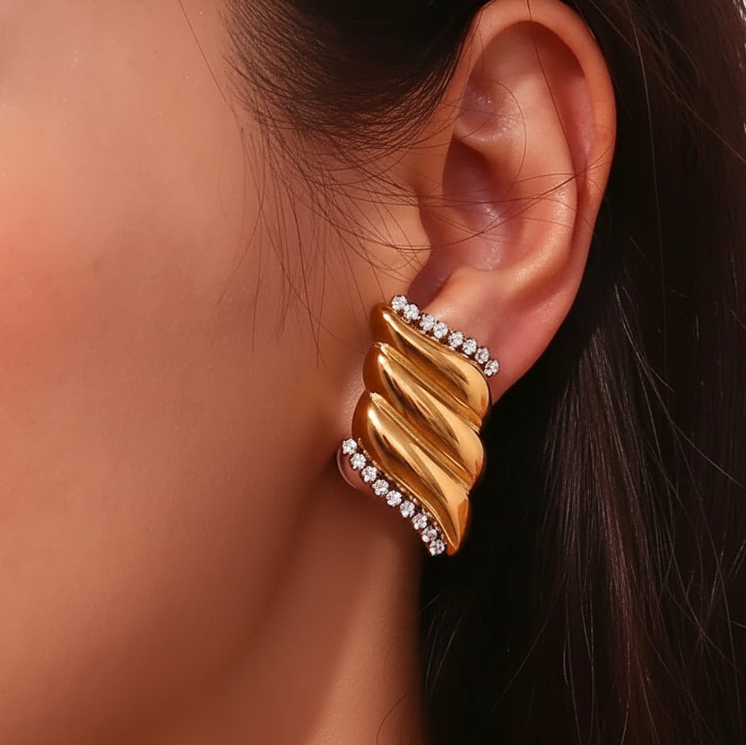 Il design mosso e tridimensionale è impreziosito da zirconi brillanti che illuminano il viso con un effetto raffinato ma d’impatto.