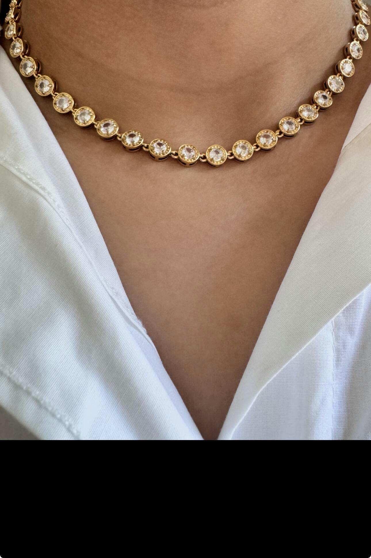 Elegante collana in acciaio inossidabile con una fila di cristalli incastonati in montatura circolare. Un design luminoso e raffinato, ideale per aggiungere un tocco di classe a qualsiasi outfit.